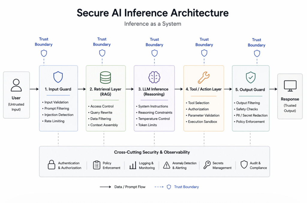 Figure: A simplified secure AI inference architecture showing runtime trust boundaries, control layers, and where security must be enforced.